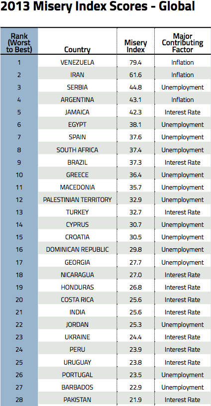 Pakistan (score 21.9) at 28 ranks below Iran (score 61.6) at 2 and India (score 25.6) at 19 on world misery index rankings for 2013 compiled by Washington's Cato Institute. Other nations worse off than Pakistan on the list include Serbia, Argentina, Jamaica, Egypt, Spain, South Africa, Brazil, Greece, Macedonia, Palestine, Turkey, Cyprus, Croatia, Dominican Republic, Georgia, Nicaragua, Honduras, Costa Rica, Jordan, Ukraine, Peru, Uruguay, Portugal and Barbados. Indonesia (score 21.6) at 29 is only slightly better off than Pakistan.